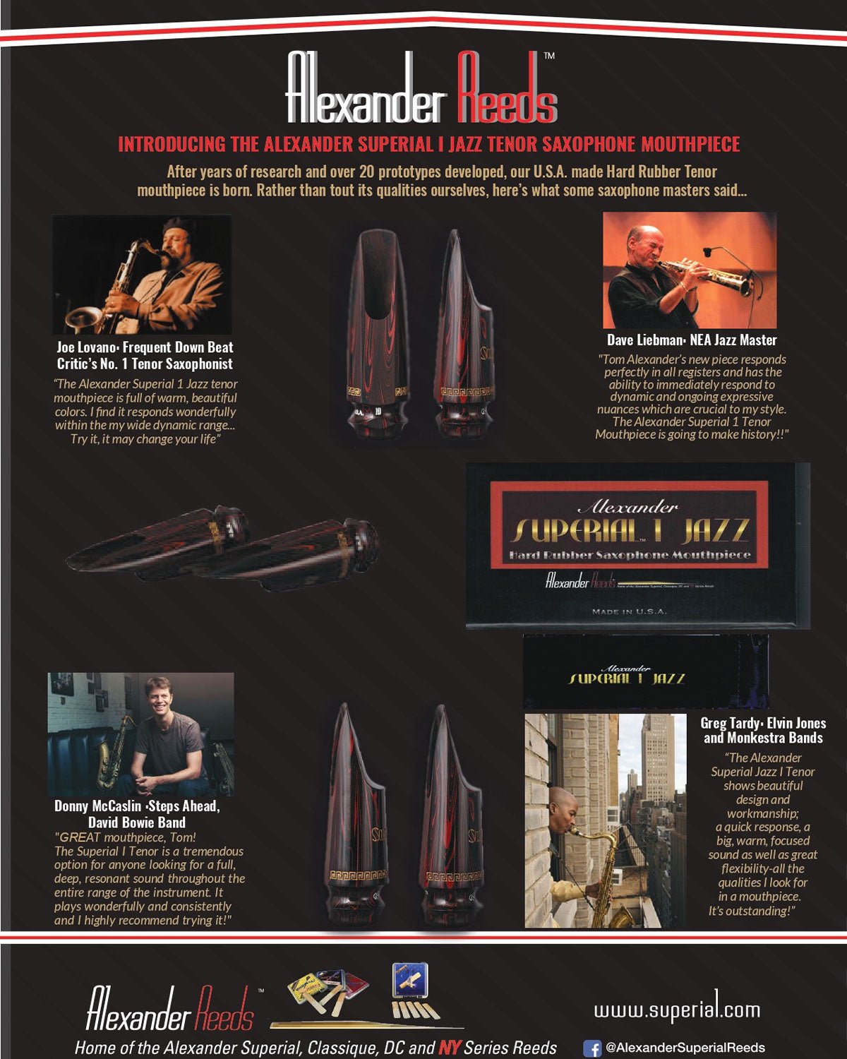 La boquilla tenor Alexander Superial 1 Jazz está llena de colores cálidos y hermosos. Me parece que responde de maravilla dentro de mi amplio rango dinámico... Pruébala, puede que te cambie la vida. Joe Lovano: el saxofonista tenor número uno según los críticos habituales de Down Beat.